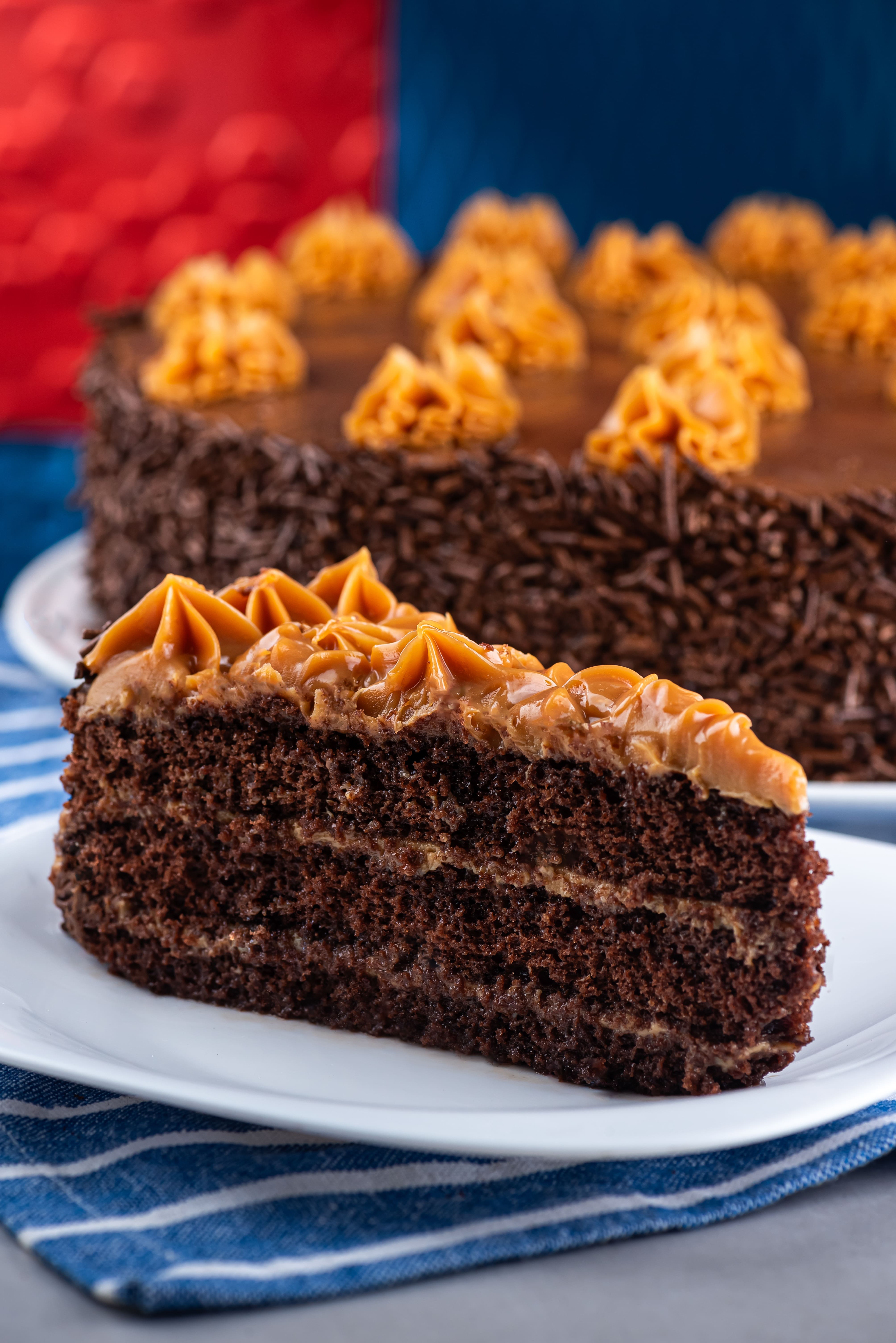 Bolo de chocolate recheado com doce de leite, cobertura de chocolate e doce de leite.