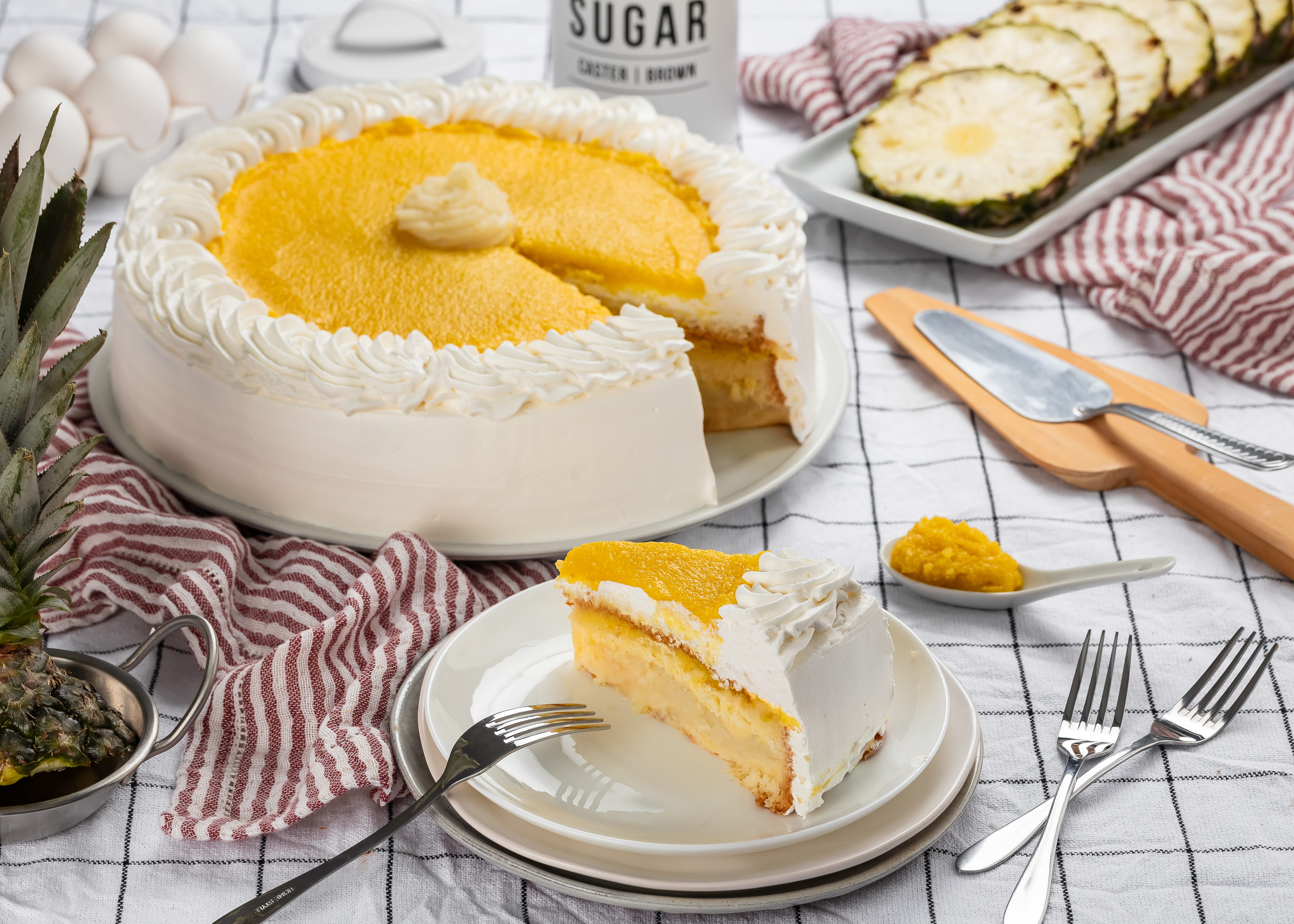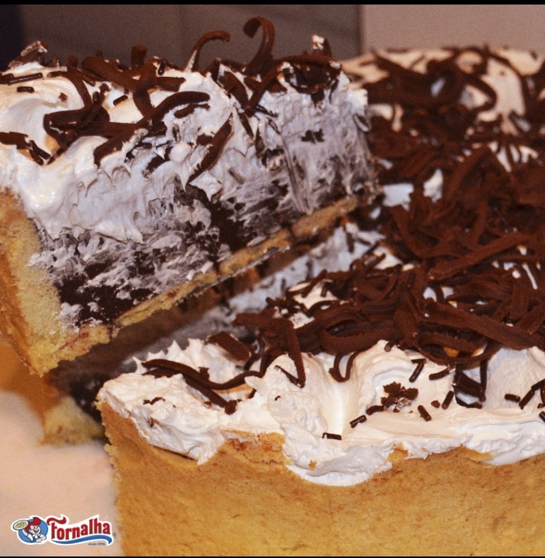 Bolo branco com recheio de abacaxi e baba de moça, coberto com chantilly.