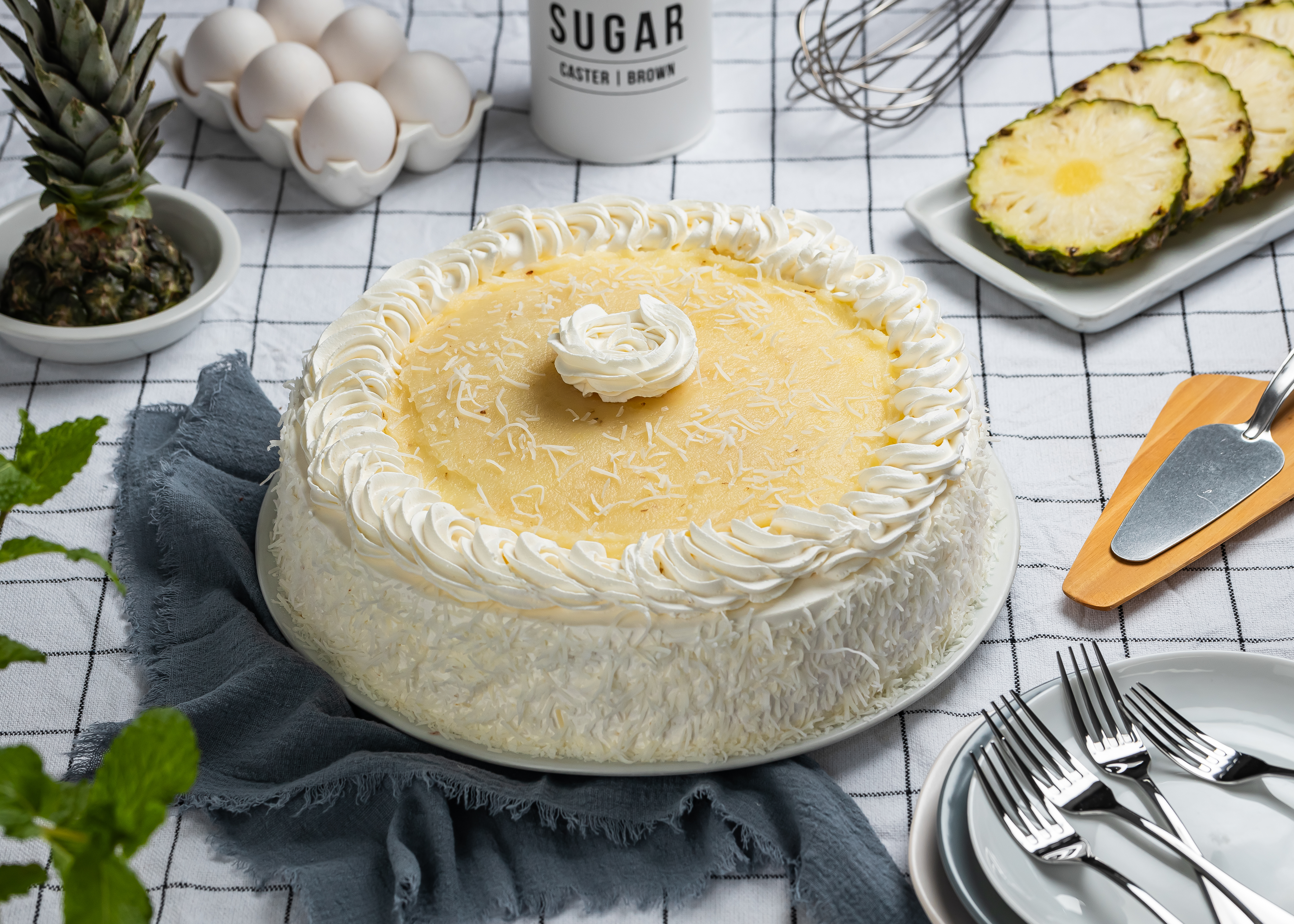 Bolo branco com recheio de doce de abacaxi, Coberto com chantilly e coco ralado.