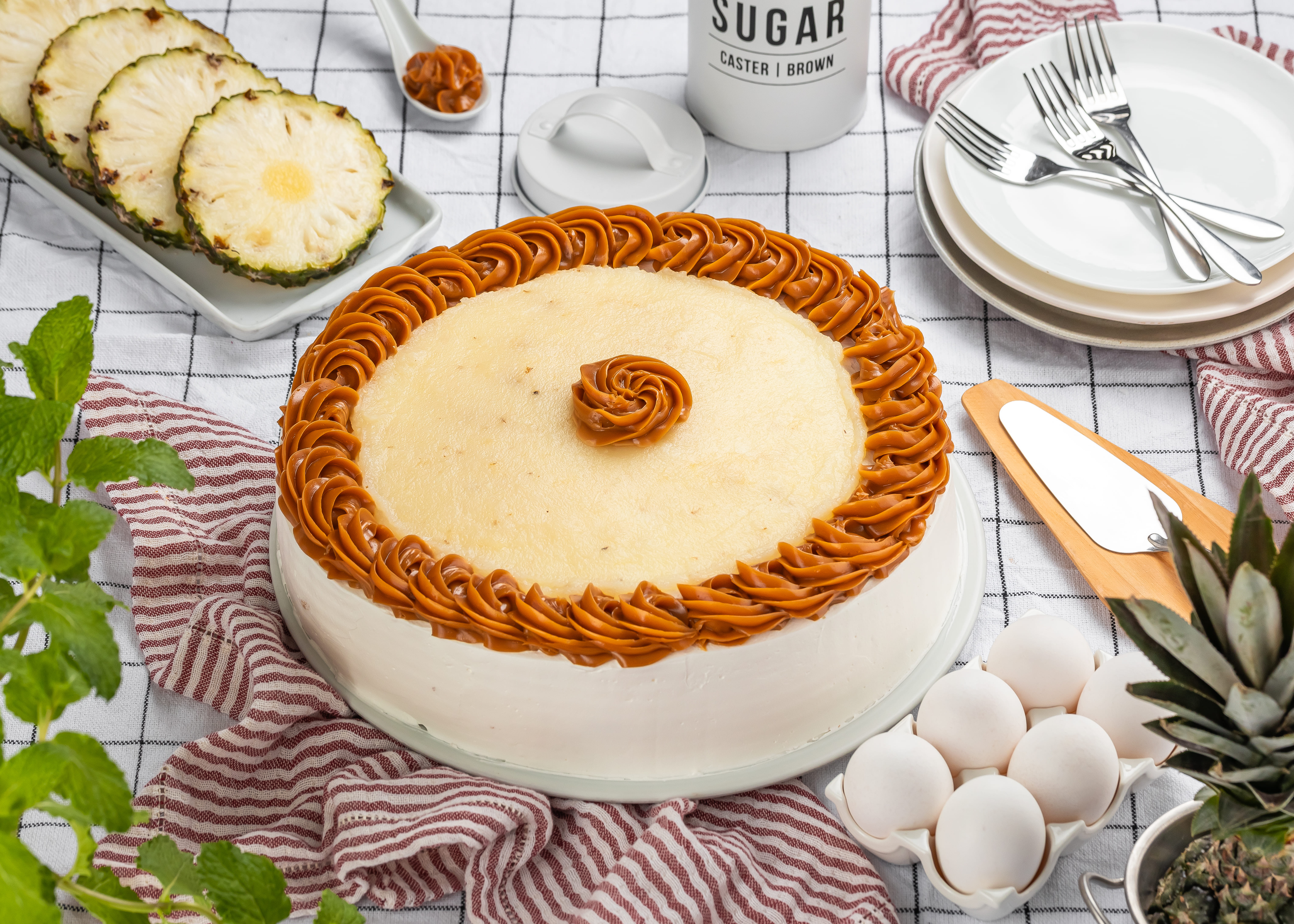 Bolo branco com recheio de abacaxi e doce de leite, coberto com chantilly.