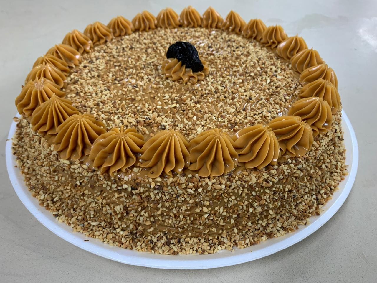 Bolo branco com recheio de doce de leite e doce de ameixa, coberta com castanha de caju.