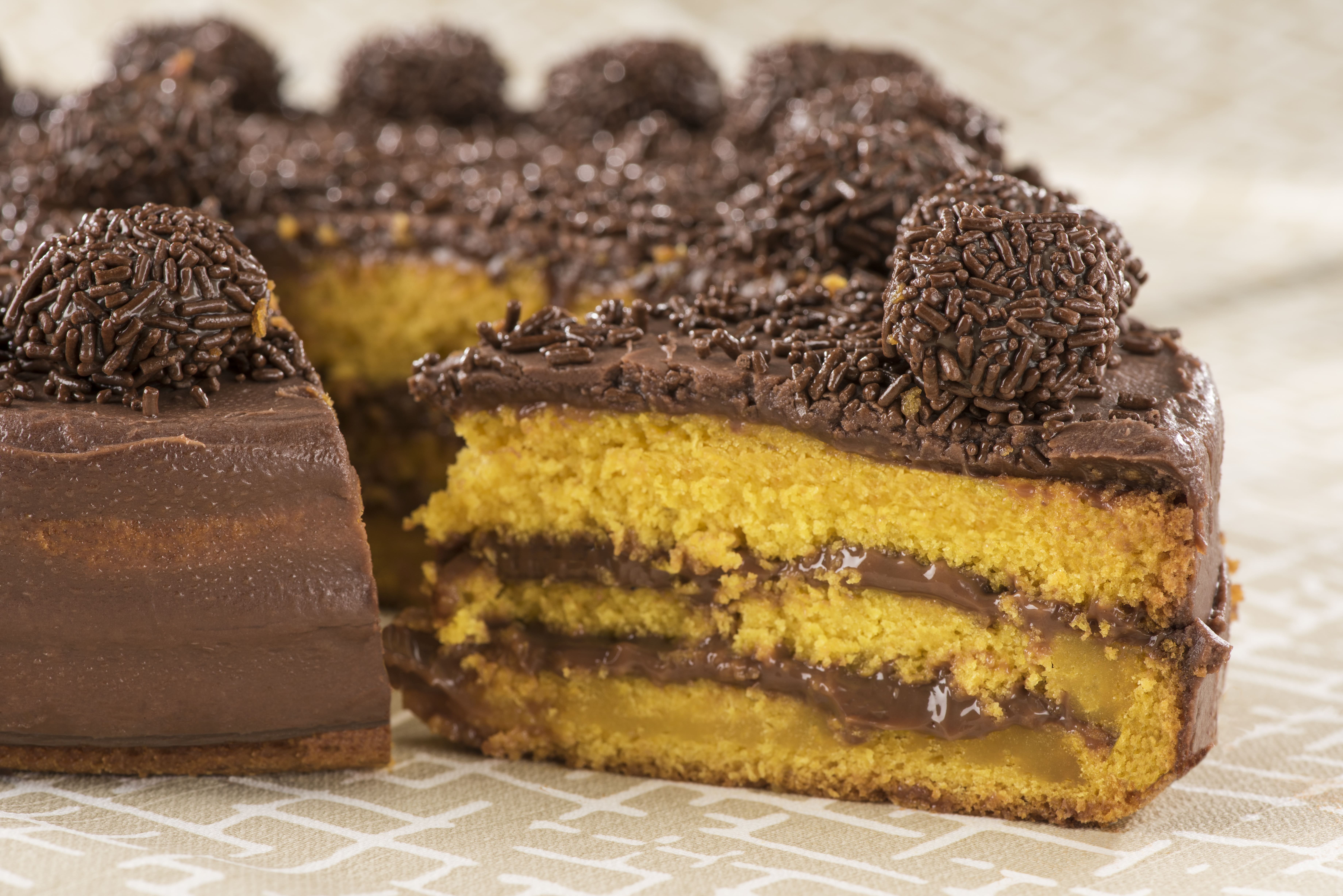 Bolo de cenoura, recheado com brigadeiro e coberto de brigadeiro granulado.