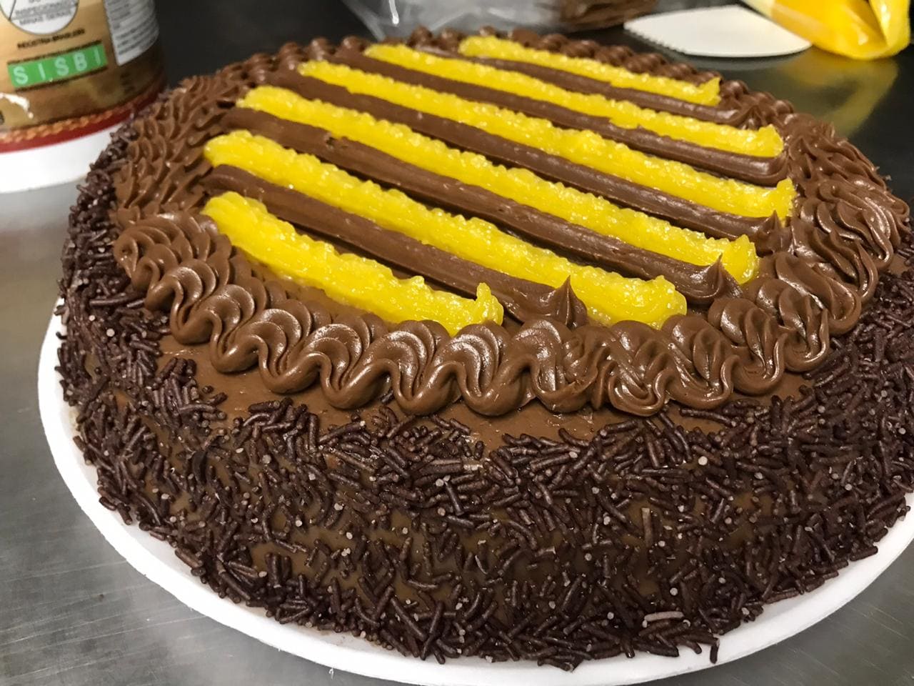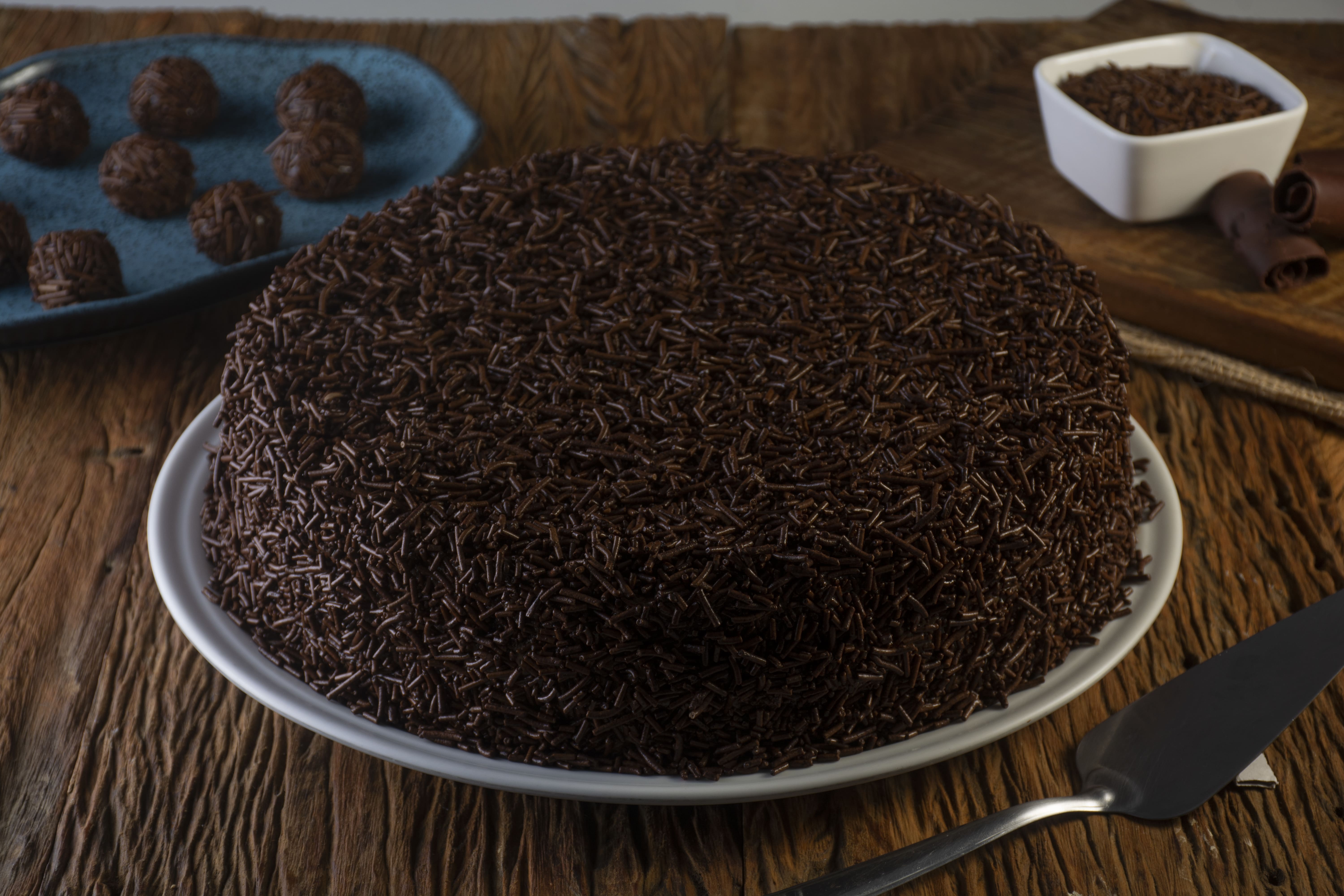 Bolo de chocolate com recheio e cobertura de brigadeiro e granulado.