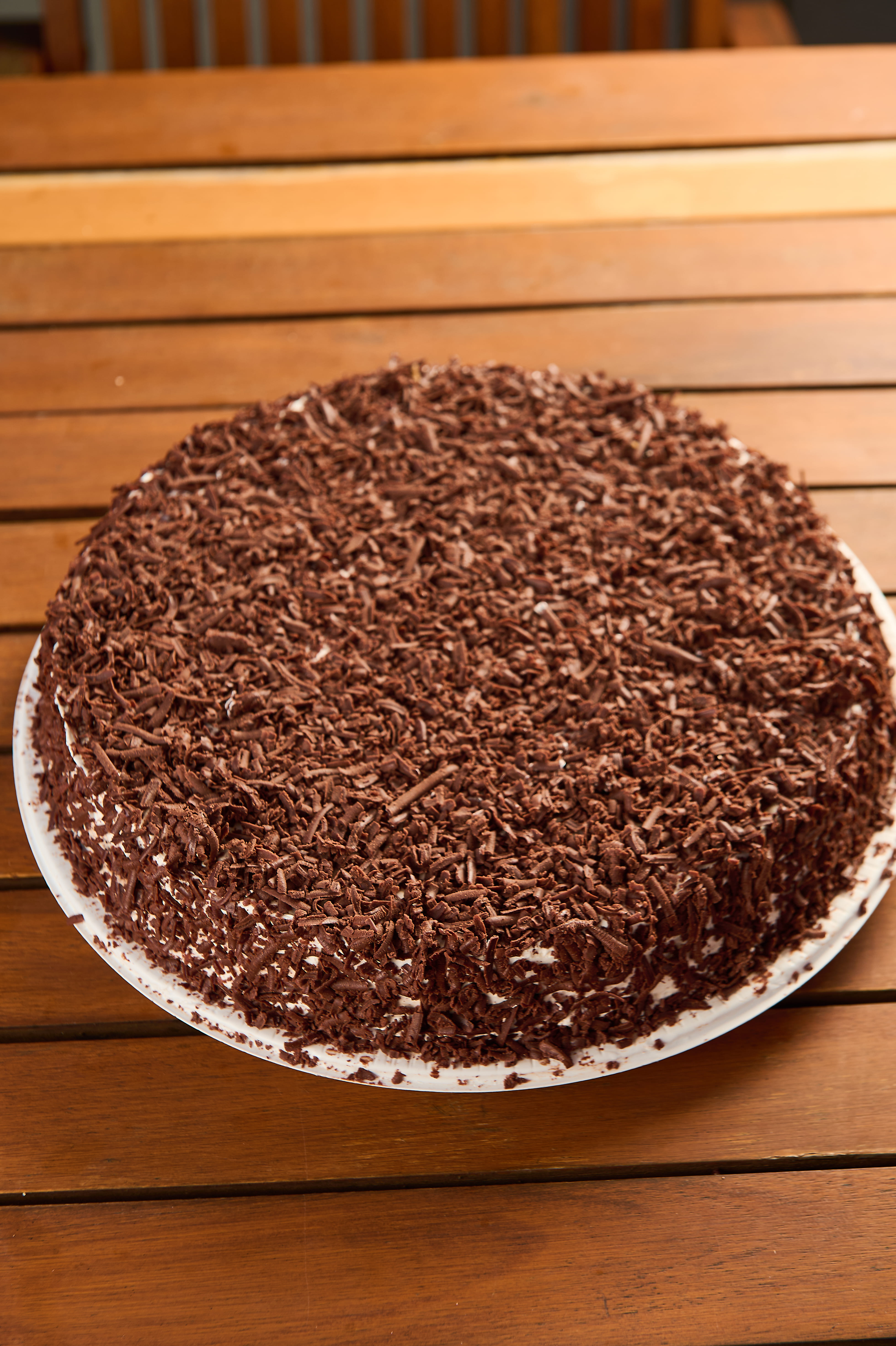 Bolo de chocolate recheado de chocolate, chantilly e cereja, coberto com chocolate.