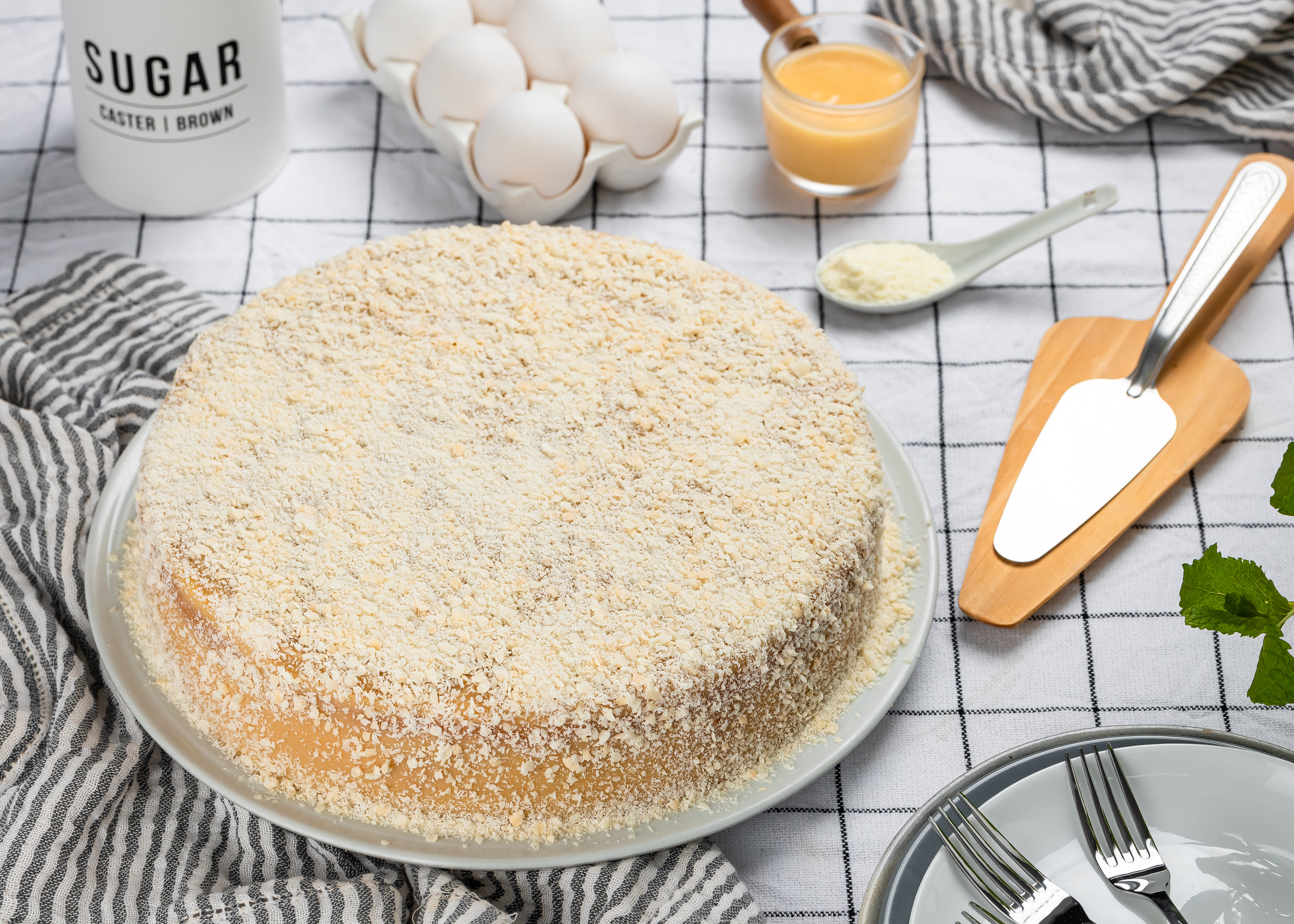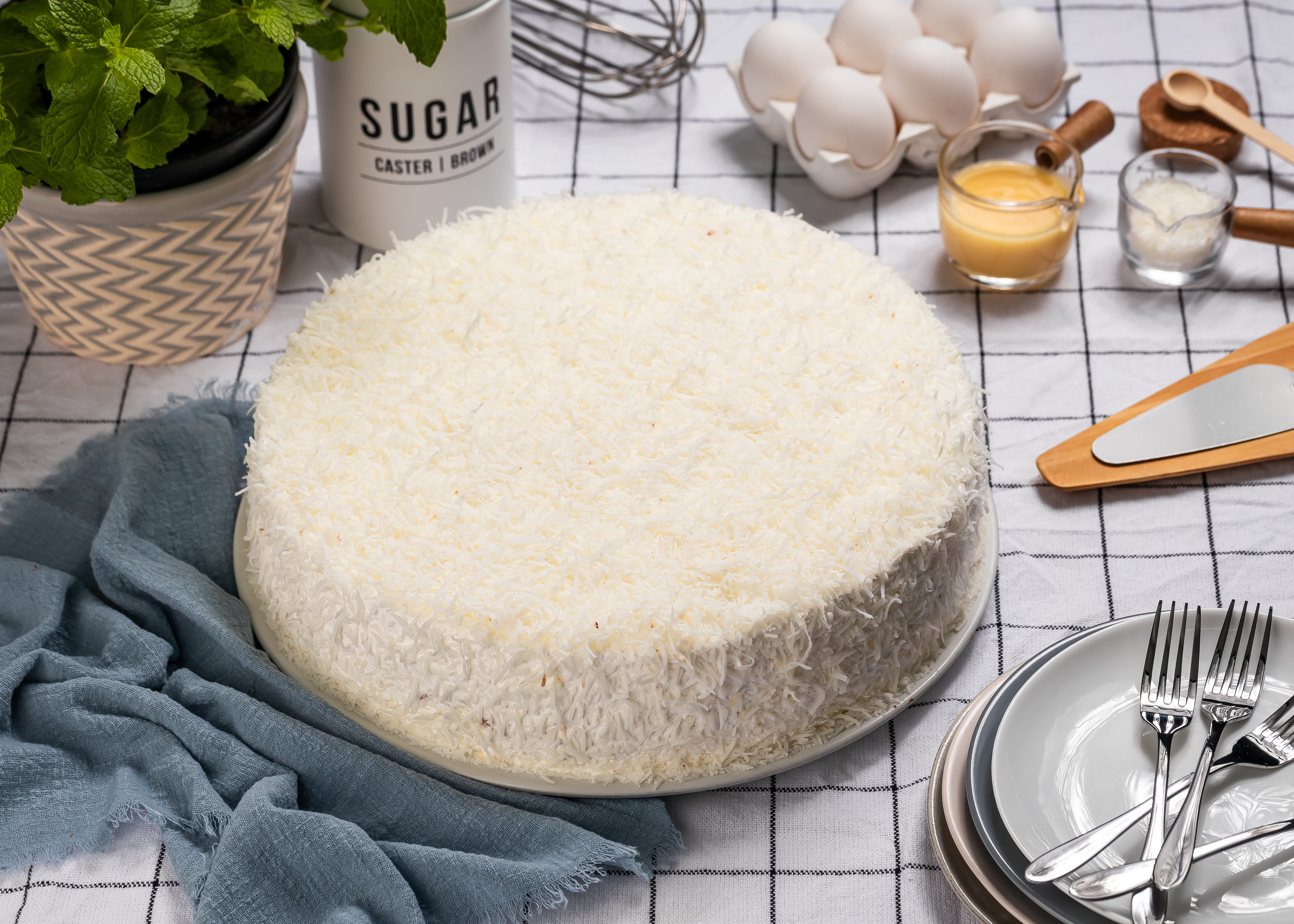 Bolo branco molhado com leite de coco, leite condensado e coberto com chantilly e coco ralado.
