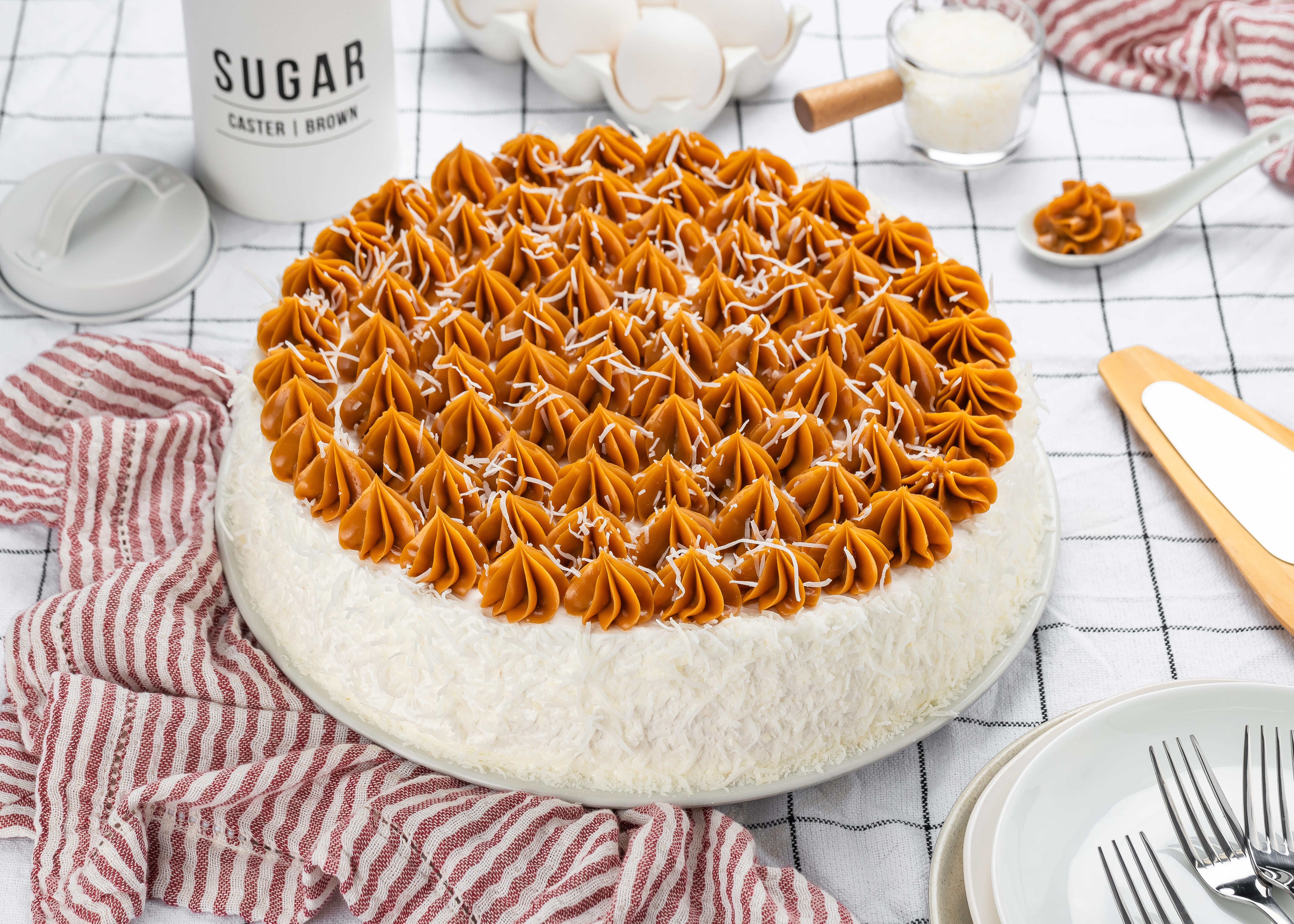 Bolo branco recheado com doce de leite, coberto com chantilly e coco ralado.