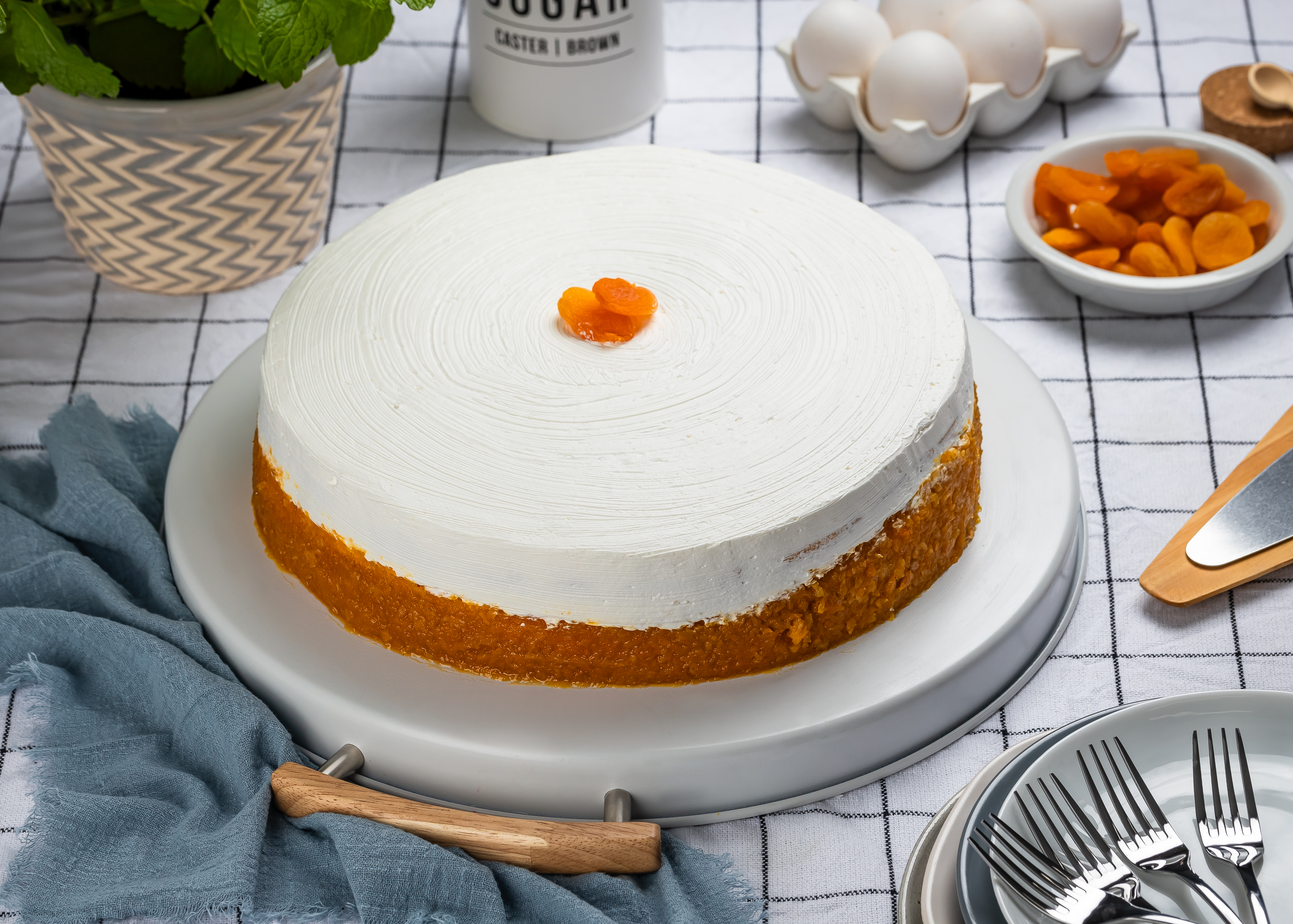 Bolo branco, recheio de chantilly com damasco e envolta de damasco e chantilly.
