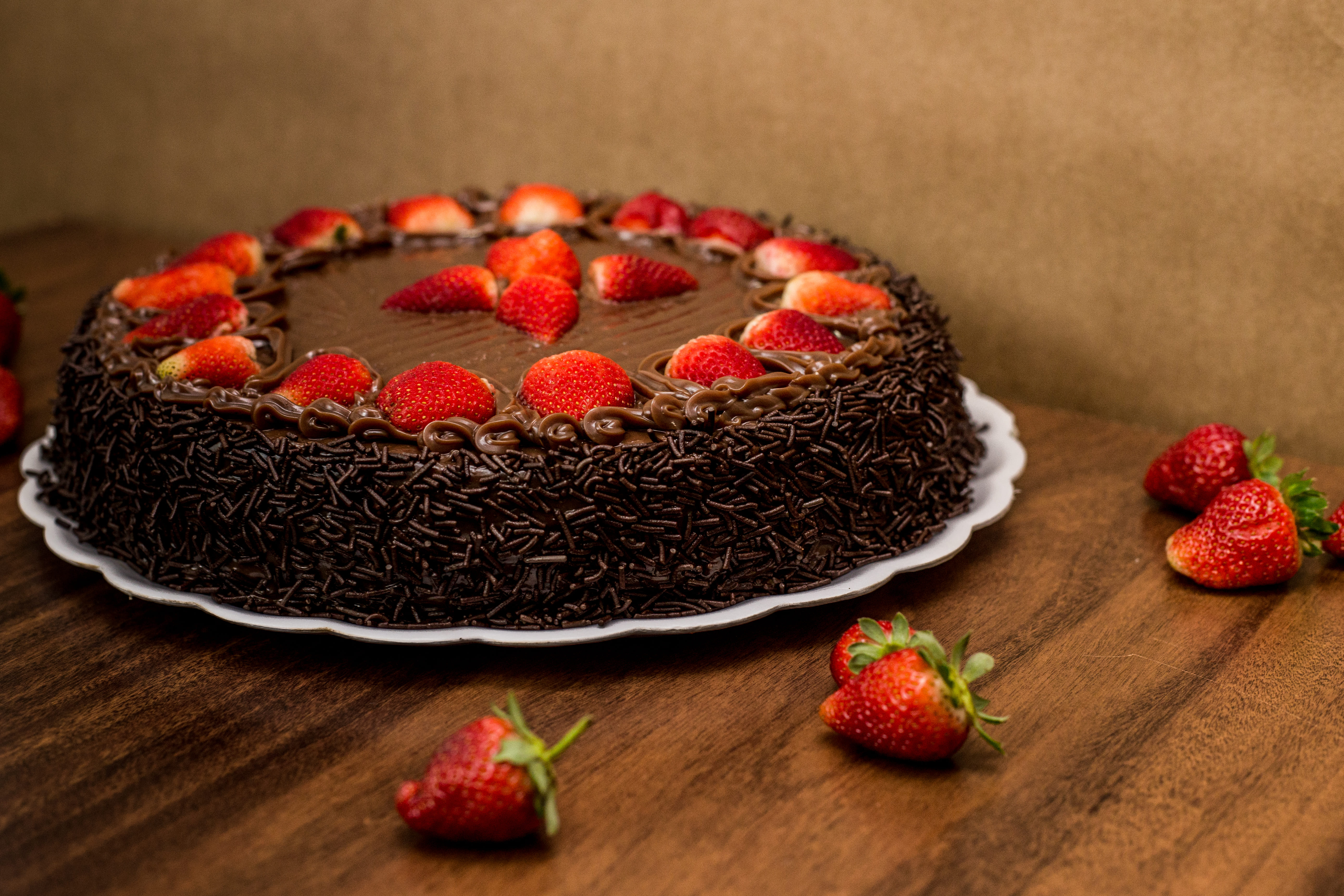 Bolo de chocolate com recheio de chocolate e morango, coberto com chocolate.