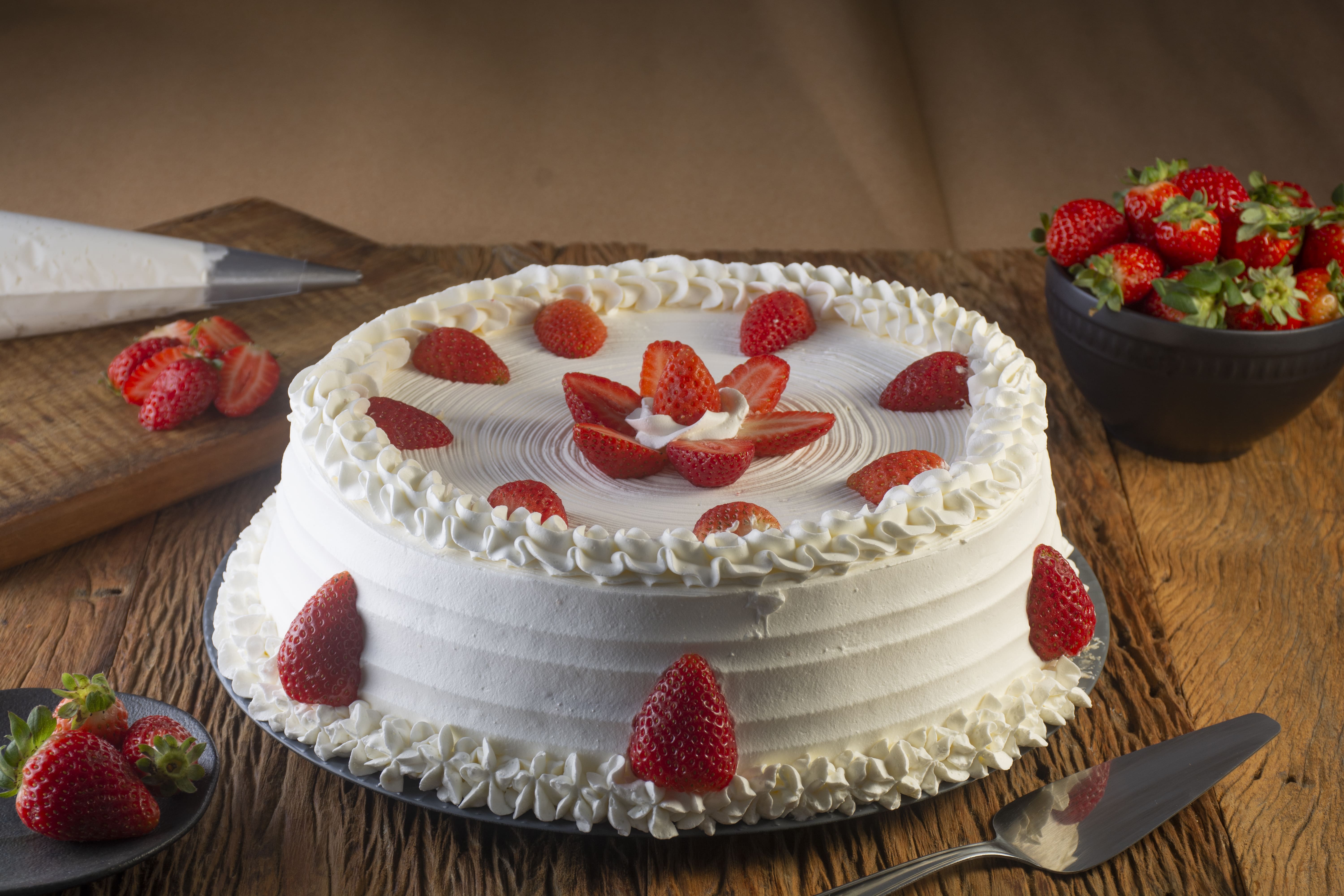 Bolo branco recheado com chantilly e morango, coberto com chantilly.