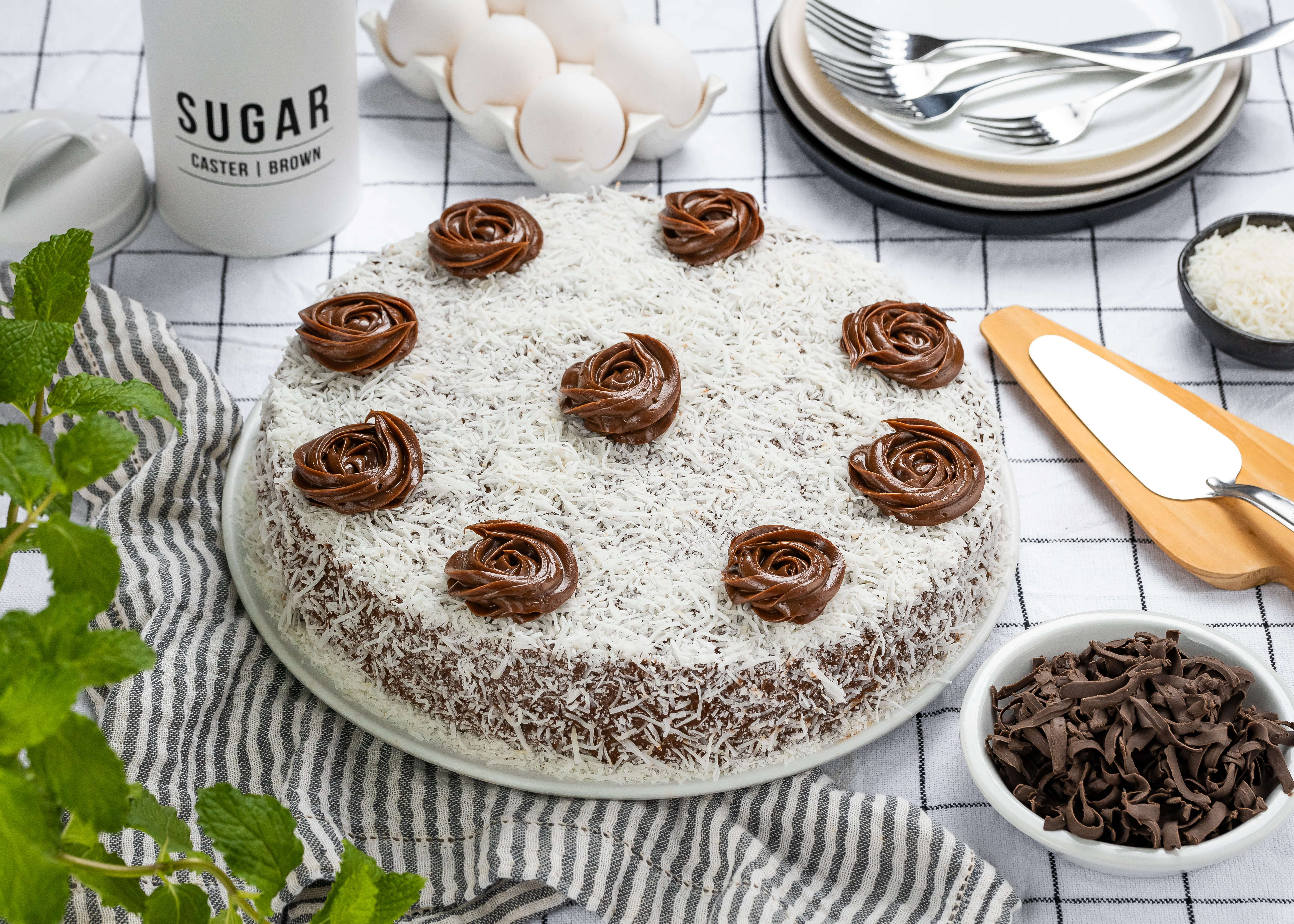 Bolo de chocolate recheado e coberto com chocolate e coco ralado.
